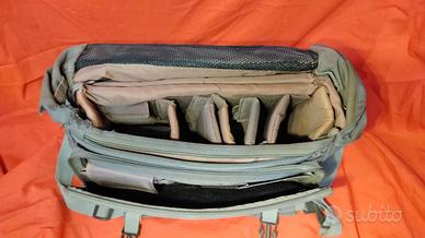 Pratico borsone fotografico Hama con tracolla e due fibbie anteriori. Ottima imbottitura amovibile e componibile con nove divisori di varie dimensioni, ancorabili con Velcro. Numerose tasche e scomparti. Dimensioni esterne 38X25X17. Visibile a Roma zona Colli Aniene.