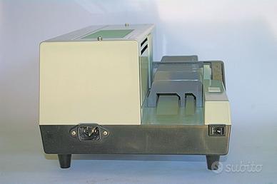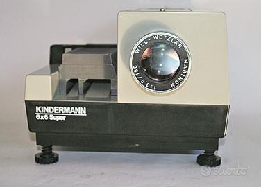 Proiettore vintage diapo medio formato 6x6 Kindermann Mod.1040 super, avanzamento manuale; obiettivo Maginon 150 f:3.0 Wetzlar. Perfetto, pari al nuovo, usato una sola volta. Lampada 24V 250W, dimensioni: 30x24x17,5 cm. Peso 5,9 Kg. Vendo a soli 135€. + spedizione nel suo imballo originale vetusto ma sano. No contrassegno