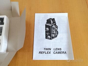 Kit di montaggio per realizzare una macchina fotografica biottica funzionante, in plastica. Una volta realizzata, la macchina fotografica avrà le dimensioni 50 mm x 63,5 mm x 127 mm.