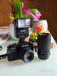 Riscopri il fascino autentico della fotografia su pellicola con questa splendida reflex analogica del 1983, completa di tutto il necessario per iniziare subito a scattare, libretti originali inclusi.