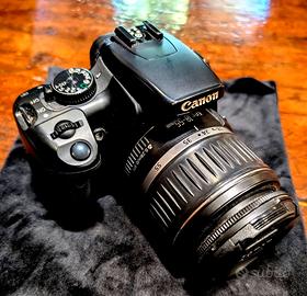 È una fotocamera reflex Canon con sensore APS-C (1.6x) con obbiettivo autofocus zoom originale Canon grandangolare 18 - 55 mm/0.28m.