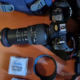 Reflex Nikon F301 con selettore esposizione rotto. Obiettivo SIGMA 28-300 F3,5-6,3 Obiettivo NIKON F 200M 35-70 F3,3-4,5 Obiettivo SIGMA 75-200 F2,8-3,5. Flash TUMAX 320tf2. 3filtri.Borsa porta tutto e borsa porta Reflex con Obiettivo.
