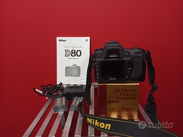Vendo Reflex Nikon D80 e Sigma 28-200 causa cambio attrezzatura. Fotocamera con doppia batteria e caricabatterie. Obiettivo Sigma 28-200 f 3.5-5.6 Hyperzoom Macro Compact Aspherical per Nikon AF D, completo di tappi e paraluce. Ottimo stato, disponibili per qualunque prova.