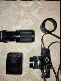 Corpo macchina + obbiettivo standard + flash(4 batterie AA). Incluso nel prezzo (come da foto) obiettivo Tamron Cf tele macro 80-210