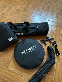 Kit composto da: REGGI FONDALE FOTOGRAFICO, TELO BIANCO IN TESSURO, PANNELLO RIFLETTENTE 5 IN 1, 2 PINZE+ TREPPIEDI PER CELLULARE