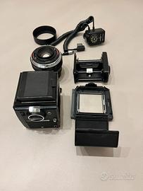 Zenza Bronica sq-a con zenzanon-ps 80mm f2.8 completo di filtro uv paraluce in metallo e tappo frontale, magazzino sq 6x6 per pellicole da 120mm. Con la macchina cedo SCA 386 Zenza Bronica necessario per collegare un flash al corpo macchina.