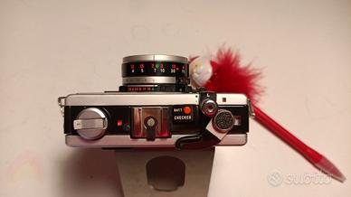 Bella Ricoh 500 GX in versione anodizzata silver Figlia evoluta della Ricoh 500G differisce da quest’ultima per i seguenti motivi: Blocco pulsante di scatto Checker battery Indicatore di Fotogramma pronto Indicatore di rullino inserito Leva di carico per le multi esposizioni Estetica diversa Bell'oggetto totalmente ricondizionato e perfettamente funzionante Esposimetro tarato per odierne pile da 1.5 V. Pulizia superficiale e profonda, guarnizioni nuove a tenuta di luce e otturatore perfetto. Mirino pulito, telemetro preciso e allineato. Ottica perfetta, pulitissima senza la minima anomalia. In condizioni estetiche più che buone questo freschissimo, piccolo ma molto affidabile strumento fotografico, è indicato per lomografia le foto di street, e la fotografia riflessiva. Le sue possibilità di esporre totalmente in manuale oppure a priorità di tempi , di bloccare l'esposizione in qualsiasi punto della scena, di poter fare multi esposizioni sullo stesso fotogramma, ne fanno un oggetto molto versatile con ottima ottica e ampia profondità di campo, pronto per l'uso e per gli amanti della fotografia analogica