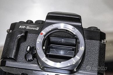 Baionetta Pentax K, completa di lente SMC 50mm Pentax M f/1.7, diaframma a 6 lamelle. Tappo anteriore.