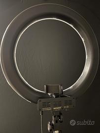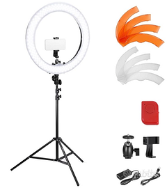 Ring light Neewer diametro 18" (45cm) per fotografia e video. Completo di stativo, supporto per smartphone, radiocomando per scatto remoto, filtro colore arancio, alimentazione 230V AC con intensità luce regolabile. Perfettamente funzionante e senza alcun segno di usura, vendo per inutilizzo.