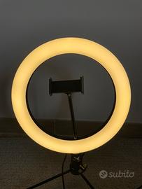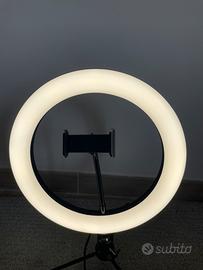 Ring light con porta smartphone. Perfettamente funzionante, ha diverse opzioni di luce (calda, neutra, fredda). Non dispone di scatola originale. Funziona con usb. Vendo per inutilizzo.
