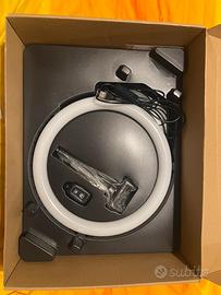 Ring light con comando remoto e tre tipologie di luce (normale, calda, fredda).