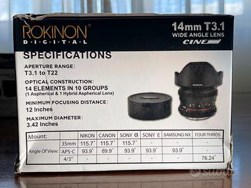 Vendo Rokinon (rebrand americano di Samyang) 14mm T3.1 ED AS IF UMC VDSLR Cine Lens per Canon EF, usato pochissimo, PARI AL NUOVO, con paraluce e scatola originale.