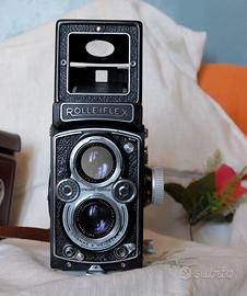 Rolleiflex 3,5 B con obiettivo Zeiss Tessar 75/3,5, completa di bella custodia in cuoio. La fotocamera è stata revisionata, tutte le funzioni rispondono in modo corretto ad eccezione del comando per la selezione di accoppiamento EV, cioè la possibilità di accoppiare tempi e diaframmi in modo automatico passando da un valore EV all'altro. Tale funzione veniva a volte appositamente eliminata dai fotografi che preferivano cambiare tempi e diaframmi in modo indipendente e secondo le proprie valutazioni. In questa macchina le ghiere dei tempi e dei diaframmi lavorano infatti correttamente senza impedimenti di accoppiamento EV. L'otturatore scatta nomalmente su tutti i tempi, messa a fuoco scorrevole, caricamento e scorrimento pellicola corretto, comando esposizioni multiple funzionante, autoscatto funzionante, sincro flash M e X funzionante, Contafotogrammi e posizionamento su primo fotogramma funzionante. Monta un classico e storico obiettivo Zeiss Tessar con lenti limpide e senza difetti, e possiede custodia in cuoio altrettanto in ottime condizioni. E' una macchina silenziosissima, pulita e piacevolissima da usare. E' stata testata con pellicola, le foto pubblicate sono state scattate recentemente su pellicola Ilford HP5 a 320 iso, l'esame del negativo ha mostrato 12 fotogrammi correttamente esposti e assenza di infiltrazioni di luce. La resa ottica è visibile dalle stesse foto pubblicate. Prego chi fosse interessato di osservare bene tutte le foto, che sono parte integrante dell'annuncio, e di contattarmi preventivamente in caso di chiarimenti e/o foto aggiuntive. ***Trattandosi di una vendita occasionale tra privati, per normativa non posso rilasciare garanzie sebbene l'oggetto risponda a quanto descritto. Anche considerando che si tratta di un oggetto di oltre settant'anni. Non sono previste restituzioni tranne nel caso che l'oggetto non corrisponda a quanto descritto. Disponibile a visione e prova senza obbligo di acquisto. Grazie.