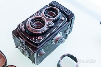Rolleiflex Tessar T3,5 con Kit di scatto su lastra fotografica in formato 6x9cm, secondo Kit per convertire il formato 120mm in 24x36cm dando la possibilità di scattare con i classici rullini 35mm. Nel set aggiungo custodia in pelle, filtri per il bianco e nero di colore arancione e giallo, paraluce in metallo, filtro soft per ammorbidire la pelle nei ritratti e il filtro polarizzatore per eliminare i riflessi.
