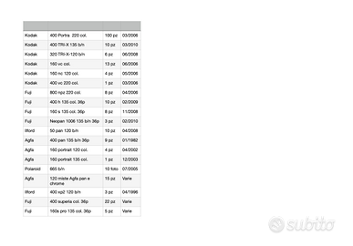 Metto in vendita rullini fotografici professionali scaduti nell'elenco ci sono quantità e scadenze, per fotografia di ricerca e sperimentazioni creative.