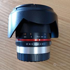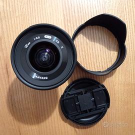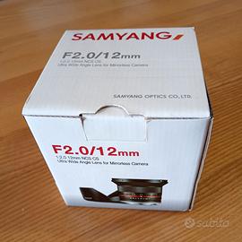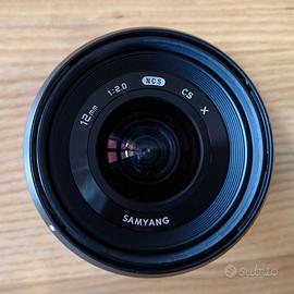 Obiettivo Samyang 12mm NCS CS f/ 2.0 per fotocamere APS-C Fuji X-mount. Completo di imballaggio originale, paraluce, tappo anteriore e tappo posteriore. Perfettamente funzionante, nessun segno d’uso, pari al nuovo. Vendo per cambio corredo.