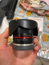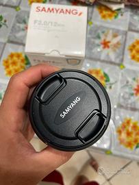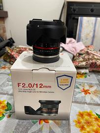 DETTAGLI - Lunghezza focale fissa 12 mm, angolo di campo APS-C 99° apertura da F2.0 a 22, limite primo piano 20 cm, 12 elementi in 10 gruppi, rivestimento Nano Coating (NC), lunghezza: filtro Ø 59 mm obiettivo Ø 67 mm 72,5 mm, paraluce rimovibile, messa a fuoco manuale