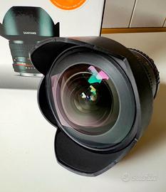 Ultragrandangolo luminoso in condizioni eccellenti con scatola e sacchetto morbido. Attacco Nikon F mount compatibile con le reflex fullframe e APS-C Nikon. Paraluce integrato. Messa a fuoco manuale