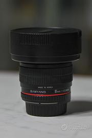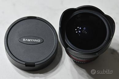 Vendo obiettivo SAMYANG 8mm f/3.5 UMC Fish-eye CS II con attacco Nikon usato con qualche piccolo segno di usura da normale utilizzo, completo di scatola, , libretto d'istruzioni, paraluce e tappi copri obbiettivo anteriore e posteriore.