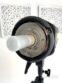 Set flash da studio LASTOLITE Lumen8 400F bulbo e lampada pilota / fotocellula (2pezzi completi di accessori) corredati da: Torce, parabole-standard, 2 stativi, 2 ombrelli riflettenti, 2 cavi sincro flas e rete, 2 borse Lastolite x il trasporto in trasferta, 2 Bank Softbox Strip (Linkstar - completi di custodie e aggancio rapido) + 1 Bank Softbox cm 50x70 (Linkstar - compatibile con custodia)