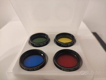 Vendo in condizioni pari la nuovo set composto da 4 filtri colorati per uso visuale con telescopi, adatti a oculari e accessori da 1.25": - giallo n.12; - rosso chiaro n.23A; - blu n.80A; - verde n.56.