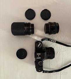 Metto in vendita la mia attrezzatura fotografica degli anni '70, un set completo ideale per chi ama ancora il rullino o per qualche studente di fotografia che vuole imparare con una macchina seria. Il pezzo forte è il corpo macchina, una Yashica FR I nera. È una reflex robusta, di quelle fatte bene, che condivide la meccanica con le famose Contax. Esteticamente è molto bella, ha solo quei segni del tempo sugli spigoli che le danno carattere. Segnalo un problema: l'elettronica e l'esposimetro funzionano bene, ma lo scatto è rimasto bloccato (probabilmente per il lungo inutilizzo). Chi se ne intende sa che basta una revisione o un po' di lubrificazione alle guarnizioni per farla tornare a scattare come nuova. Il corredo comprende: Obiettivo Yashica ML 50mm f/1.7: Un'ottica eccezionale, molto luminosa e nitida, lenti pulite e diaframma perfetto. Solo questo vale il prezzo del set. Grandangolo Naigon 28mm f/2.8: Ottimo per i paesaggi. Zoom Naigon 70-210mm f/4-5.6: Con funzione Macro per i dettagli. Insieme regalo la sua borsa dell'epoca, la tracolla originale e un paraluce in gomma.