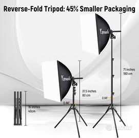 2 luci regolabili, a ombrello quadro, lampade da 5500K, 2 contrappesi. Con borsa-custodia.
