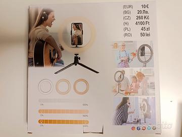 Il set comprende: anello per selfie. Temperatura della luce, bianco, bianco caldo e neutro. 10 livelli di luminosità. Potenza 10 W, Input 5 V/ 1 A DC Output 5V 1 A. lunghezza del cavo 2 metri. Collegamento: USB. Marca Tedi.