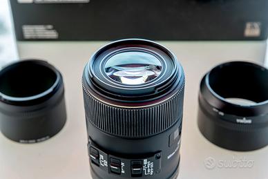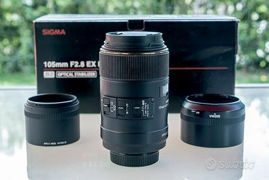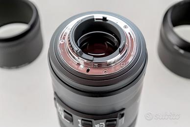 Ottica Sigma 105mm F2.8 con innesto Nikon. Copre il doppio formato FF full frame e APS-C mezzo formato. Stabilizzato in due modalità. Doppio paraluce per i due formati, tappi frontale-posteriore e scatola.
