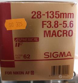 Zoom Sigma con attacco per Nikon AF D focale 28-135, corredato anche di filtro UV. Nella sua confezione originale, utilizzato un paio di volte e poi riposto con cura in ambiente salubre, quindi privo di muffe o altri problemi. Ulteriori dati li trovate in rete, comunque ai tempi era il migliore zoom in questa fascia di prezzo.