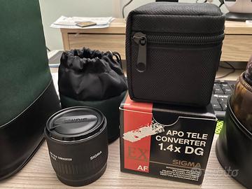 Vendo Sigma 300mm f/2.8 APO EX HSM con cover mimetica come da foto piu+ Tele converter 1.4 e 2.0 . la foto rispecchia il materiale in vendita