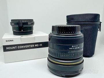 Sigma obiettivo 8mm f/3.5 EX DG circular fisheye attacco Canon + sigma mount converter MC-11 per attacco Sony E mount. Ideale per FF e APS C messa a fuoco manuale e automatico. Angolo di campo 180