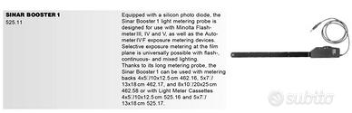 SINAR BOOSTER1 525.11 con esposimetro Minolta flash meter IV Con Messkassette 4x5/9x12 Equipped with a silicon photo diode, the Sinar Booster 1 light metering probe is designed for use with Minolta Flashmeter III, IV and V, as well as the Autometer IV F exposure metering devices. Selective exposure metering at the film plane is universally possible with flash-, continuous- and mixed lighting. Thanks to its long metering probe, the Sinar Booster 1 can be used with metering backs 4x5″/10x12.5 cm 462.16, 5x7″/ 13x18 cm 462.17, and 8x10″/20x25cm 462.58 or with Light Meter Cassettes 4x5″/10x12.5 cm 525.16 and 5x7″/ 13x18 cm 525.17. LIGHT METER CASSETTE 4x5″/10x12.5 cm 525.16