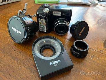Vendo sistema Nikon Coolpix 4300 composto da : corpo macchina coolpix 4300 - Nikon Tele Converter TC-E2 2x - Nikon Wide Converter WC-E24 0.66x - Luce flash anulare Nikon SL-1 - anello adattatore Nikon UR-E4 + serie completa di manuati IT/ENG + cavo connessione USB corpo macchina - PC + 4 schede compact flash + case originale