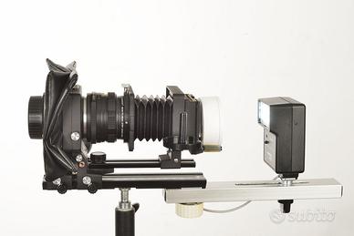Sistema modulare per duplicazione ad alta risoluzione di diapositive 35mm intelaiate e negativi, dia in striscia o singoli fotogrammi. Basato su soffietto macro UNITOR (produzione OEM condivisa con Minolta, Fujica, Konica, Contax, Yashica, ecc.), soffietto rifatto con stoffa in CORDURA impermeabile e super robusta, struttura metallica, guide precise e regolazione continua dell’estensione. Ottica: • Helios MC 44-7 58mm f/2 (attacco M42x1) • Diaframma a preselezione manuale • Ottimale per riproduzioni macro, condizioni eccellenti. • ( Escludibile dalla vendita x €. 40 - se siete già in possesso di un ottica adeguata ) Rapporto di Riproduzione : • Estensione 1:1 → ~58 mm. • Copertura completa fotogramma 24x36 mm • Su sensori: 24 MP → >4000 dpi, 36 MP → ~5500 dpi, 45 MP → >6000 dpi Qualità finale proporzionale al sensore. Illuminazione : • Flash HANIMEX (4x AA) → elimina micromosso • Supporto flash in alluminio con slitta con regolazione longitudinale per controllo preciso dell’esposizione in funzione del diaframma • Luce pilota LED per centratura, messa a fuoco del fotogramma. Illuminazione uniforme e rapida, ideale per archivi estesi. Compatibilità: • Attacco posteriore Nikon FX - Full Frame oppure M42x1 • Attacco anteriore ottiche M42x1 • Possibile modifica con altri attacchi fotocamera su richiesta. Flusso di lavoro: 1. Inserimento diapositiva/negativo 2. Centratura con luce LED 3. Scatto flash sincronizzato 4. Eventuale tethering diretto a PC per controllo immediato. Contenuto della Vendita: • Video demo per l’utilizzo. • Soffietto macro UNITOR in Cordura • Duplicatore dia 35mm • Supporto negativi • Supporto flash in alluminio • Luce pilota LED • Obiettivo Helios Multi Coated 44-7 58mm f/2 • Flash Hanimex CX 418 modificato con cavetto lungo di sincro-X Non inclusi nella vendita Testa Manfrotto, NikonD850 e stativo. Sistema rapido, preciso e professionale per digitalizzazione di archivi 35mm con qualità superiore agli scanner tradizionali.