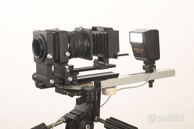 Sistema modulare per duplicazione ad alta risoluzione di diapositive 35mm intelaiate e negativi in striscia. Basato su soffietto macro UNITOR (produzione OEM condivisa con Minolta, Fujica, Konica, Contax, Yashica), struttura metallica, guide precise e regolazione continua dell’estensione.