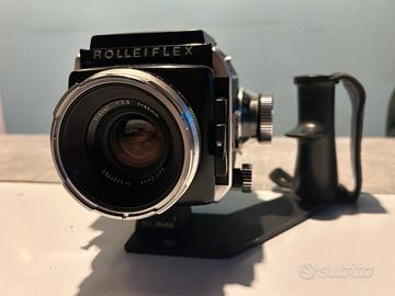 Rolleiflex sl66 camera medio formato con custodia in pelle, obiettivi w80mm f.2,8; 50mm f. 4; 250mm f5,6; A12 back, polaroid back,chassis per pellicola piana, filtri in gelatina e porta filtri ., maniglia, pentapriisma. Segni d uso ma tutto funziona bene. Ritiro a carico dell acquirente .