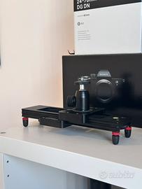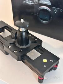Dotato di piedini regolabili, livella integrata e carrello scorrevole su binari a cuscinetti, garantisce scorrimento preciso e silenzioso. Compatibile con fotocamere mirrorless, DSLR e videocamere.