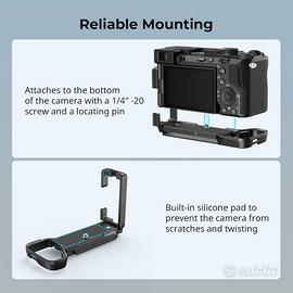 - Si fissa alla parte inferiore della fotocamera tramite una vite da 1/4" -20 e un perno di posizionamento, con un cuscinetto in silicone incorporato per evitare graffi e torsioni.