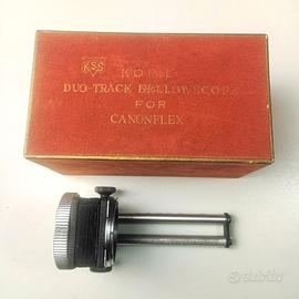 Questo oggetto è un Kopil Duo-Track Bellowscope, un soffietto per macrofotografia vintage prodotto in Giappone dalla Kopil. Questo modello specifico è progettato per il sistema Canonflex, la prima serie di reflex 35mm di Canon introdotta alla fine degli anni '50. Permette di aumentare la distanza tra l'obiettivo e il corpo macchina per ottenere ingrandimenti elevati nelle fotografie macro. È dotato di due binari ("duo-track") per una regolazione precisa della messa a fuoco. L'immagine mostra il soffietto in ottime condizioni, completo della sua custodia originale in velluto rosso.