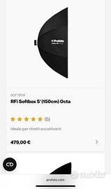 Softbox PROFOTO RFI 5" ( 150 cm ) pari al NUOVO + bag profoto softbox + velo diffusore € 250 ( Anello RFI Speedring PROFOTO acquistato a parte, vendo nel caso non ne siete in possesso, a soli € 90, e' necessario come attacco per questo softbox )
