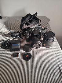 macchina fotografica Sony a100 con sensore CDD. perfettamente funzionante e comprendente: - obiettivo Sony DT 18-70 f 3.5/5.6 - obiettivo tele sigma 70-210 f 4/5.6 - 2 schede di memoria da 512mb, una espandibile - 2 batterie con caricabatterie -cavo USB -borsa da viaggio - copriobiettivi e coprisensore