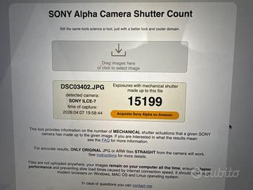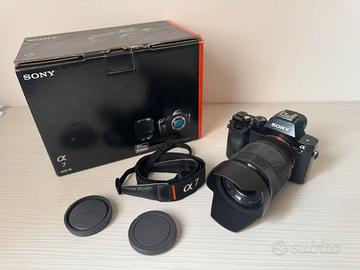 Sony A7 prima versione con obiettivo zoom 28/70 Tenuta benissimo, perfettamente funzionante. 15.199 scatti in tutto. Con piastra per sgancio rapido (che aumenta anche il grip). Imballo originale. Preferisco consegna a mano