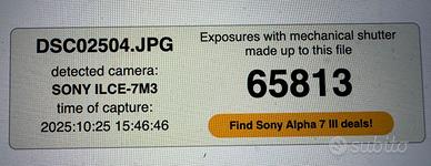 Sony A7 III in ottime condizioni, la uso come seconda camera. Con 65813 scatti. Vendo con una batteria, scatola e carica batteria. La venfo per passarea Sony A7 IV.