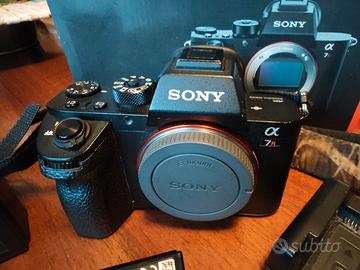 Sony a 7R2 completa di Scatola, manuali, tracolla (mai usata),3 batterie e caricabatterie originali + batterie e caricabatterie Patona. 8000 scatti circa, nel 2023 è stata ricondizionata: sostituito otturatore, LCD e copertura in finata pelle. unico proprietario fotografo amatore.