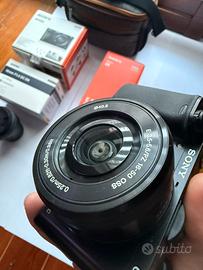 Vendesi per inutilizzo splendido kit fotografico Sony Alpha 6000 (ILCE-6000). La macchina è praticamente immacolata, utilizzata pochissimo: il contatore segna solamente 160 scatti totali. Tutti i componenti sono completi di scatole originali, imballaggi. COSA COMPRENDE IL SET: • Corpo Macchina Sony alpha 6000: Sensore APS-C da 24.3 MP, autofocus velocissimo e design compatto. • Obiettivo Sony 16-50mm f/3.5-5.6 OSS: Obiettivo zoom "pancake" versatile, ideale per l'uso quotidiano e video (già montato in foto). • Obiettivo Sigma 16mm f/1.4 DC DN Contemporary: Una lente fissa incredibile, super luminosa, perfetta per ritratti, paesaggi e video con sfondo sfocato (bokeh) di alta qualità. • Obiettivo Sony 55-210mm f/4.5-6.3 OSS: Teleobiettivo zoom per catturare soggetti a distanza (sport, natura). • Accessori Inclusi: • Borsa da trasporto imbottita. • Caricabatterie e cavi originali. • Scatole originali di tutti i prodotti. Consegna a mano zona Pinerolo (TO) e dintorni