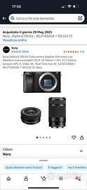 Vendo fotocamera Sony Alpha 6100, corpo macchina in ottime condizioni, usata pochissimo e sempre tenuta con la massima cura. compresa di kit obiettivi, acquistata in data 29/05/2025