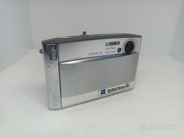 Fotocamera Sony Cybershot DSC-T5 con batteria e cavo di ricarica. Flash funzionante. Si riceve ciò che è in foto. Caratteristiche Risoluzione sensore: 5,1 Megapixel, Tipologia display: 2,5" TFT Memoria flash supportata: Memory Stick Duo, Memory Stick PRO Duo Modalità di scatto: Modalità filmato immagine per immagine, Apertura lente: F/3.5-4.4 Regolazione messa a fuoco: Automatico, manuale Zoom ottico: 3x,Lunghezza focale: 6.33 / 19 mm Zoom digitale: 2x, Flash: Flash incorporato, Riduzione occhi rossi: Sì Tipo di microfono: microfono incorporato Batteria supportata: 1 batteria ricaricabile Colore: Argento, Dimensioni (LxPxA): 9.4 x 2 x 6 cm,Peso: 0.1 kg. Disponibili foto di esempio. NO GARANZIA, NO RESI.