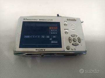 Fotocamera Sony Cybershot DSC-T5 con batteria e cavo di ricarica. Flash funzionante. Si riceve ciò che è in foto. Caratteristiche Risoluzione sensore: 5,1 Megapixel, Tipologia display: 2,5" TFT Memoria flash supportata: Memory Stick Duo, Memory Stick PRO Duo Modalità di scatto: Modalità filmato immagine per immagine, Apertura lente: F/3.5-4.4 Regolazione messa a fuoco: Automatico, manuale Zoom ottico: 3x,Lunghezza focale: 6.33 / 19 mm Zoom digitale: 2x, Flash: Flash incorporato, Riduzione occhi rossi: Sì Tipo di microfono: microfono incorporato Batteria supportata: 1 batteria ricaricabile Colore: Argento, Dimensioni (LxPxA): 9.4 x 2 x 6 cm,Peso: 0.1 kg. Disponibili foto di esempio. NO GARANZIA, NO RESI.