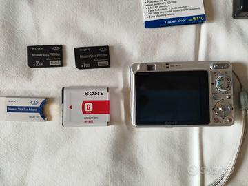 Vendo per inutilizzo fotocamera digitale SONY DSC-W110 perfettamente funzionante, in ottime condizioni, Zoom Wide/Tele e macro. Mirino ottico. Cavo USB audio/video. Scheda memoria SONY originale 1GB + una da 2GB. Caricabatterie e 1 batteria. con scatola e tutti i suoi accessori come visti in foto. Consegna a mano.